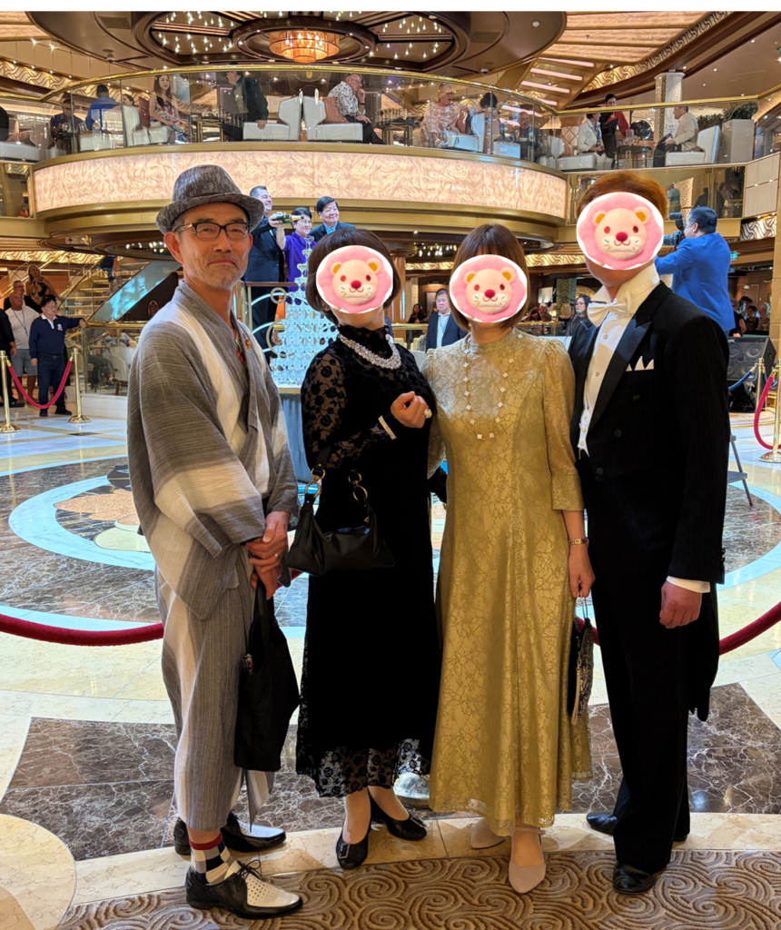 私が、「シャンパンタワー」の順番を待っているときに、近くの外人の方から、「着物姿がステキですね!」って英語で言われました。もちろん、それだけじゃなく、船の中を歩いているときなど、いろいろなところで「ナイス ファッション!」なんて声をかけてもらいました。