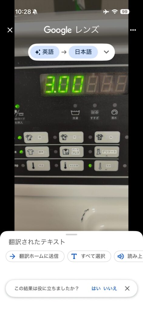 まず、洗濯機の説明書きを、Google翻訳で撮って、「量」、「水温」、「強弱」のボタンを押して、