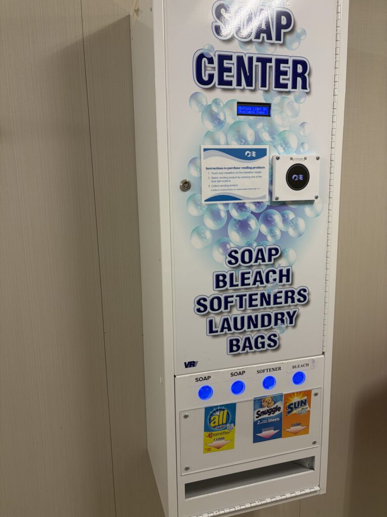 時間が来たので、ランドリールームに行って洗濯機を取り出して、匂いと、乾き具合を確かめて、「ok」と思って袋に詰めて、ふと、壁側を見たら、洗剤なんかの販売機があって…