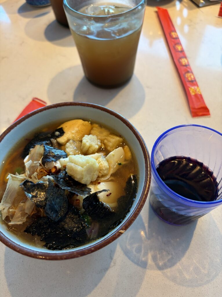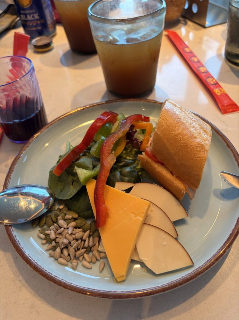 その後は、16階のデッキで、4人でワインを飲みながらランチをしました。珍しくヌードルがあったのでヌードルを食べました。