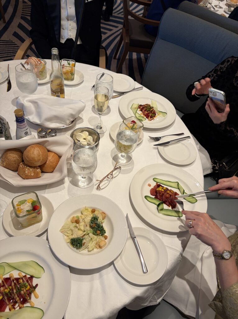 本日の夕食は、ドレスコードが、「フォーマル」ですので、みんな、オシャレしてレストランに行き、まず、スパークリング乾杯し、夕食が始まりました。