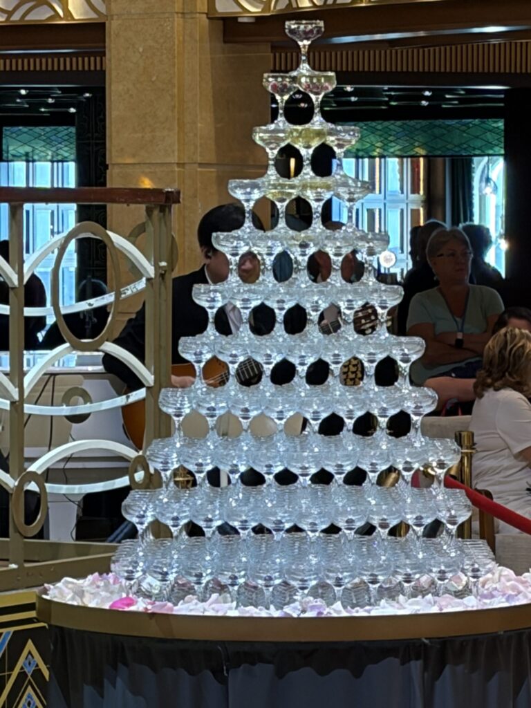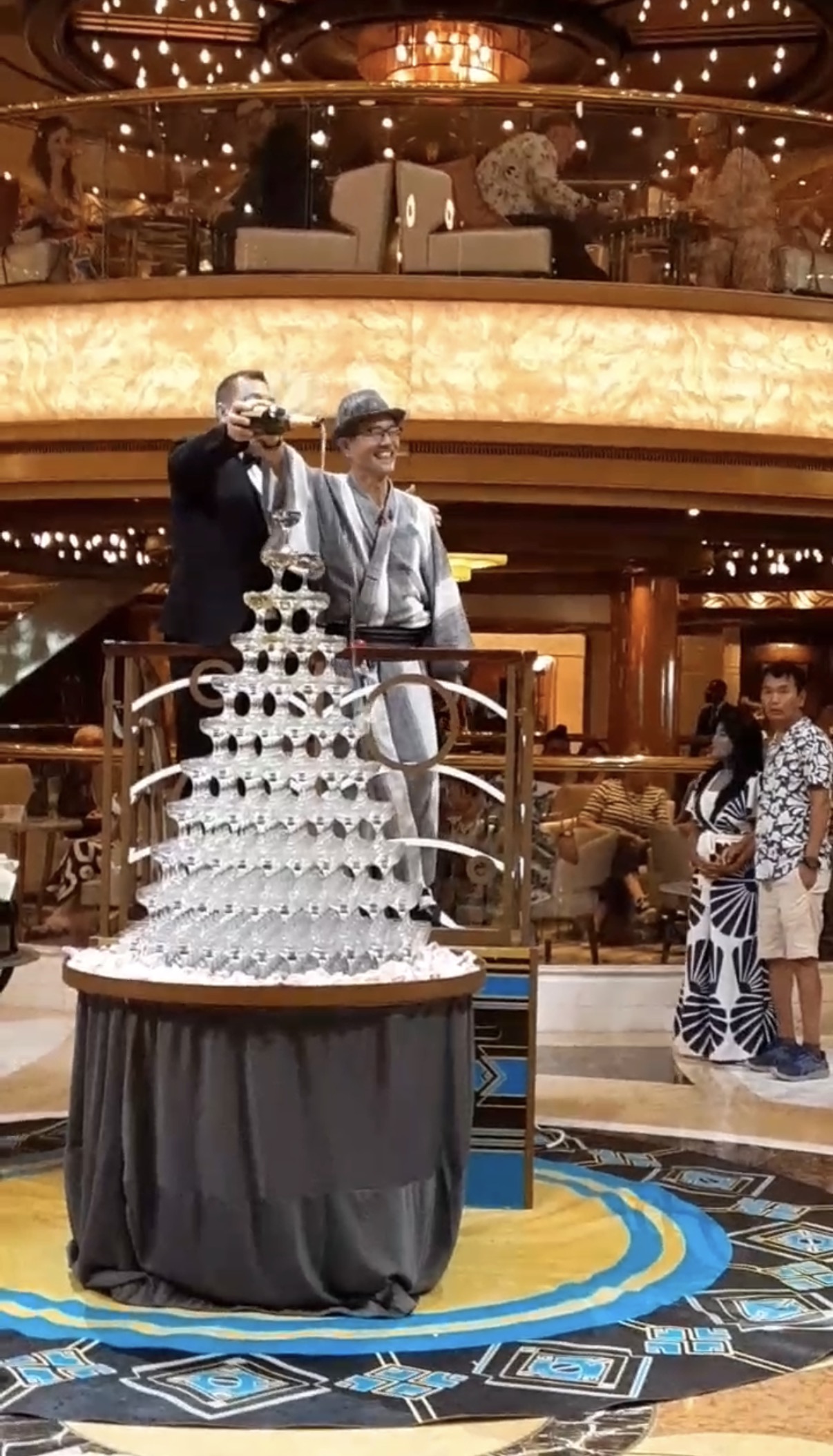 「船長とシャンパンタワー」のイベントは、船長が、船の主要なクルーを紹介し、その後、シャンパンタワーに、船長がシャンパンを注いで、その後は、乗客が、シャンパンタワーにシャンパンを注ぎ、その写真を撮ってもらうイベントでした。