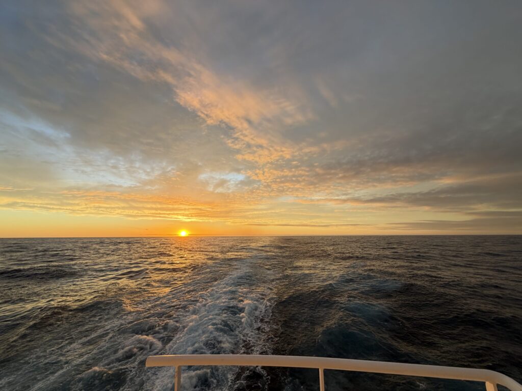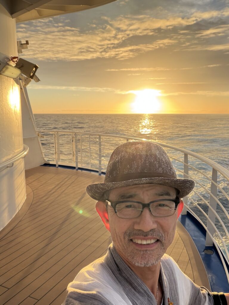 その後、6階の後方デッキに出て、水平線に沈む夕日を眺めました。この夕日の沈む光景も、一生忘れないだろうなぁ・・・なんて思いました。