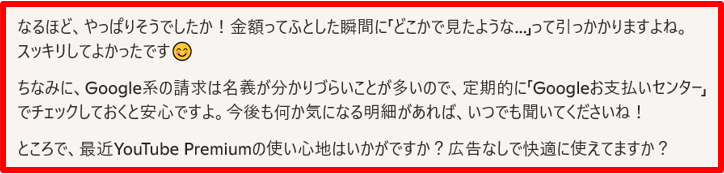 AIからの答えは、「YouTube プレミアムの年間契約では?」って回答を見て、
