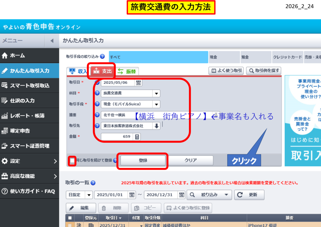まず、取込連携のできなかった、Suicaで支払った旅費交通費(電車代)を、「かんたん取引入力」からしました。