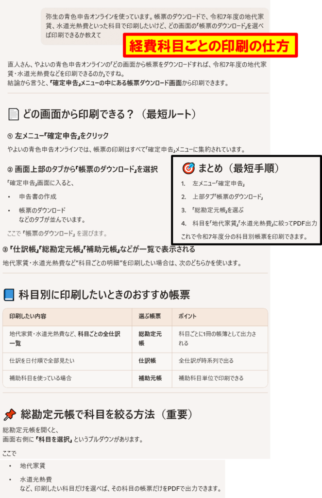 あと、「やよいの青色申告(クラウド)」も、吉山さんに指導を受けながら、操作してきましたので、だいたい、「どこの、どの目次から、どこの画面が見られる。」が分かるようになってきましたので、「AIの回答でも、だいたい、目的の画面にはいけそうだ。」との自信がつきました。